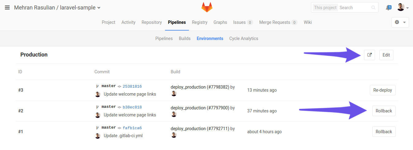 After our code passed through the pipeline successfully, we can deploy to our production server by clicking the play button on the right side.