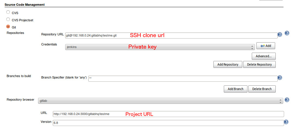 Jenkins needs read access to the GitLab repository. We already specified a private key to use in Jenkins, now we need to add a public one to the GitLab project. For that case we will need a Deploy key. Read the documentation on how to setup a Deploy key.